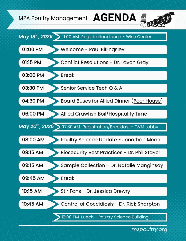 The MPA Poultry Management School will be held May 19–20, 2026, at MSU (240 Wise Center Drive, Mississippi State, MS). For event location information, please click HERE! Make plans now to attend this two-day event filled with valuable educational opportunities, networking, and good times. The annual Allied Member Crawfish Boil will once again be held at The Poor House (1581 W. Poor House Rd., Starkville, MS 39759). For additional information on sponsorship opportunities or booth availability, please click HERE! This course has been approved by RACE & PAACO for 6.75 hours of continuing educational credit.